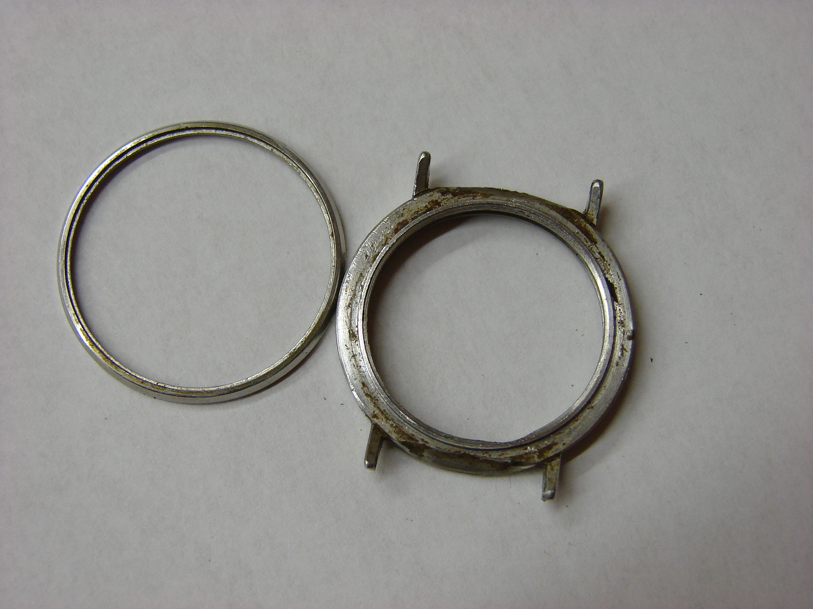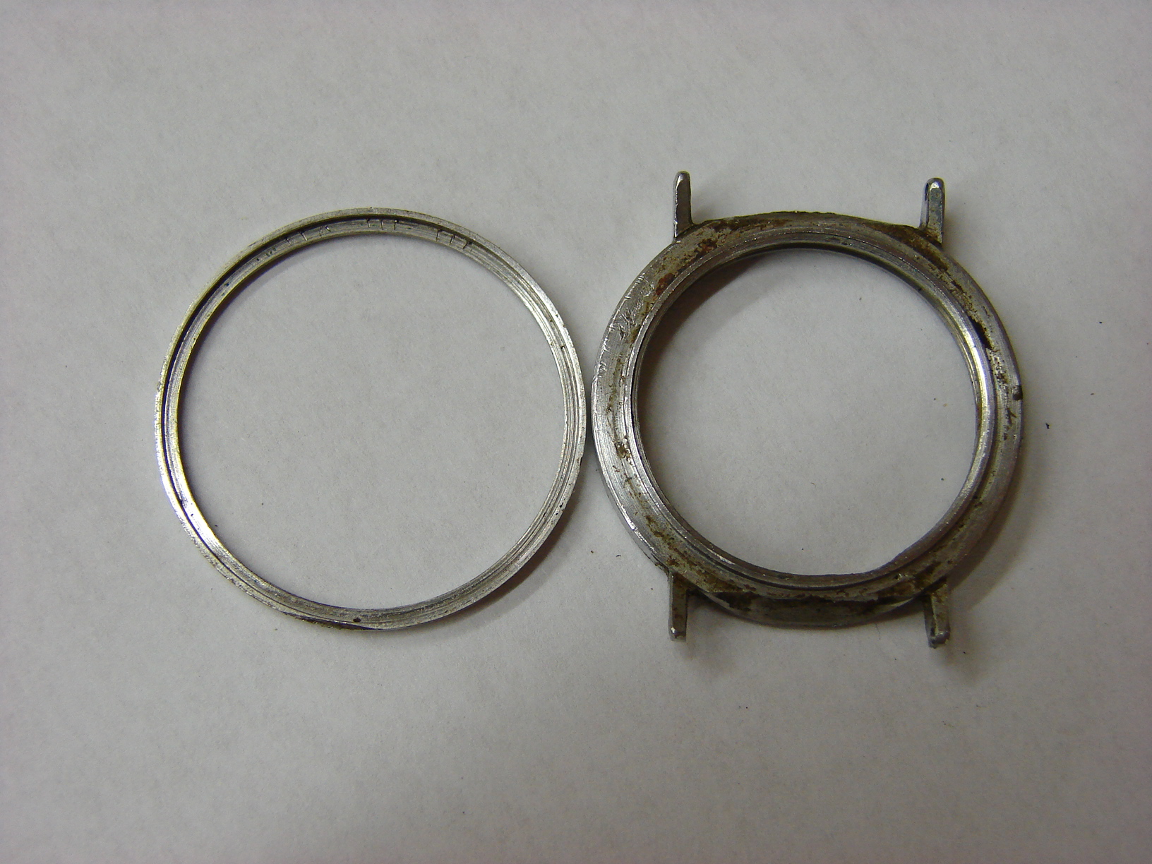 Elgin case fits 8/0 size mvt, chrome bezel has soem brassing. Case back is screw down style all stainless steel. No holes in case. Email for more pics.