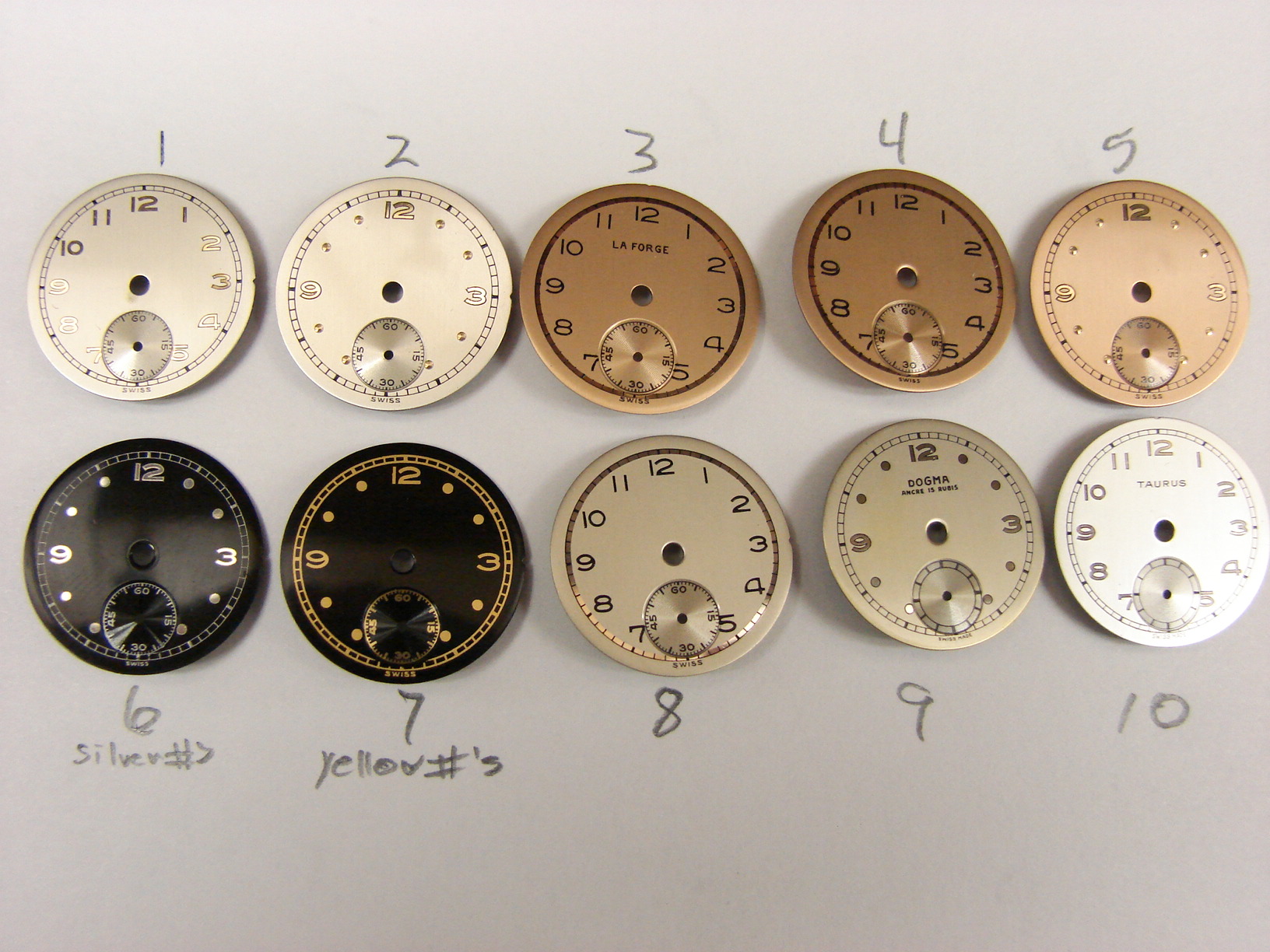 A Schild, caliber 1240, no-seconds model, dials pick your style. Five to choose from. Price listed is for each dial. When you check out note which dial number you want in the notes section of your paypal payment. We will ship that dial only. If you want two or more just change the quantity when you check out and note which dials you want. More than one of several available. Several diameters to choose from. Email with questions. New stock from the 1940's and 50's.