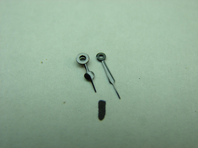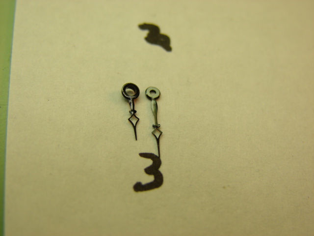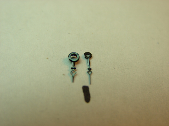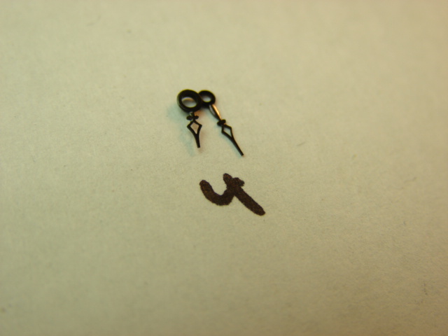 Cathedral style hand pair. Black color. Hour=4mm, hole=1.20mm/ Minute=5mm, hole= .75mm. Vintage hands from the 1930's or 40's.