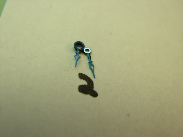 Cathedral style hand pair. Blue color. Hour=4mm, hole=1.20mm/ Minute=5mm, hole= .75mm. Vintage hands from the 1930's or 40's.