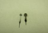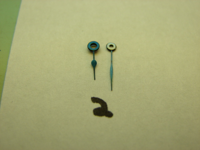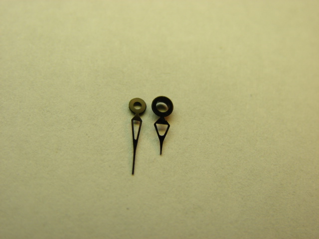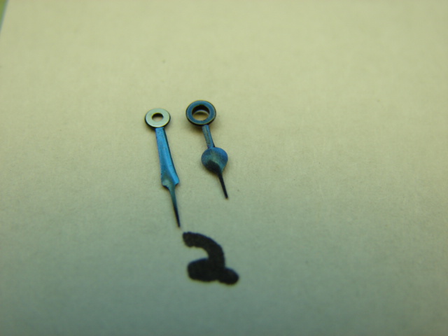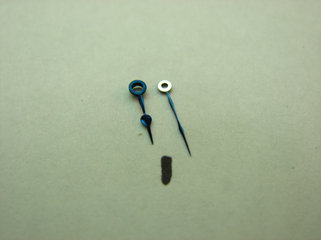 Spade style hand pair. Black or Blue color. Hour=7.5mm, hole=1.30mm(black or blue) Minute=9.5mm, hole= .80mm(black). Minute=9.5mm, Hole= .85(blue) Vintage hands from the 1930's or 40's.