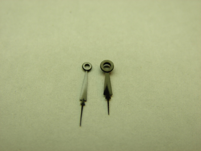 Modern New style hand pair. Black color. Hour=8.5mm, hole=1.30mm/ Minute=10.5mm, hole= .80mm. Vintage hands from the 1930's or 40's.