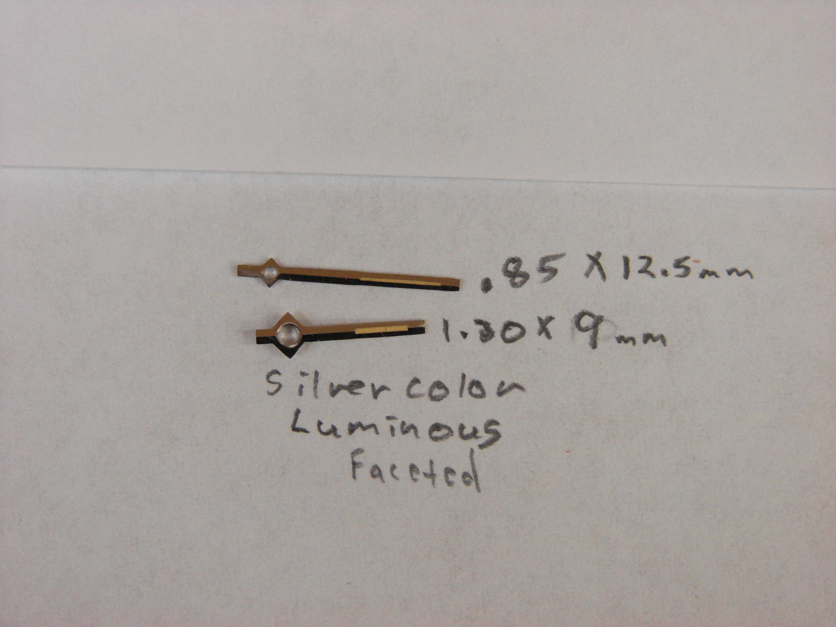 Wristwatch hands, luminous, silver block index style with diamond shape around hole. High quality swiss made hands from the 1950's. Luminous material no longer glows