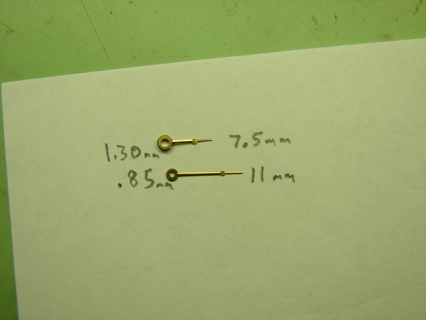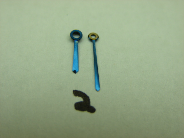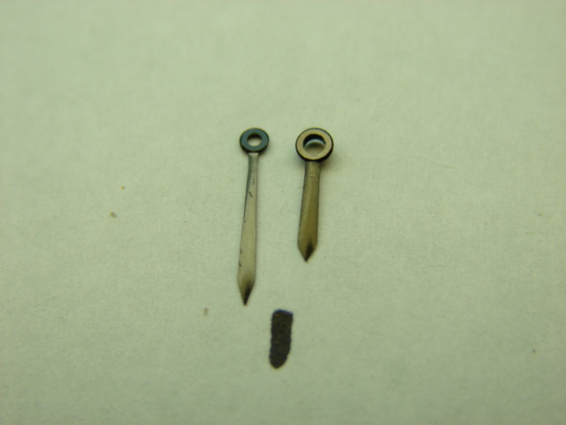 Baton style hand pair. Black or Blue color your choice. Hour=7mm, hole=1.30mm/Minute=10mm, hole= .85mm. Vintage hands from the 1930's or 40's. Note which color when you pay
