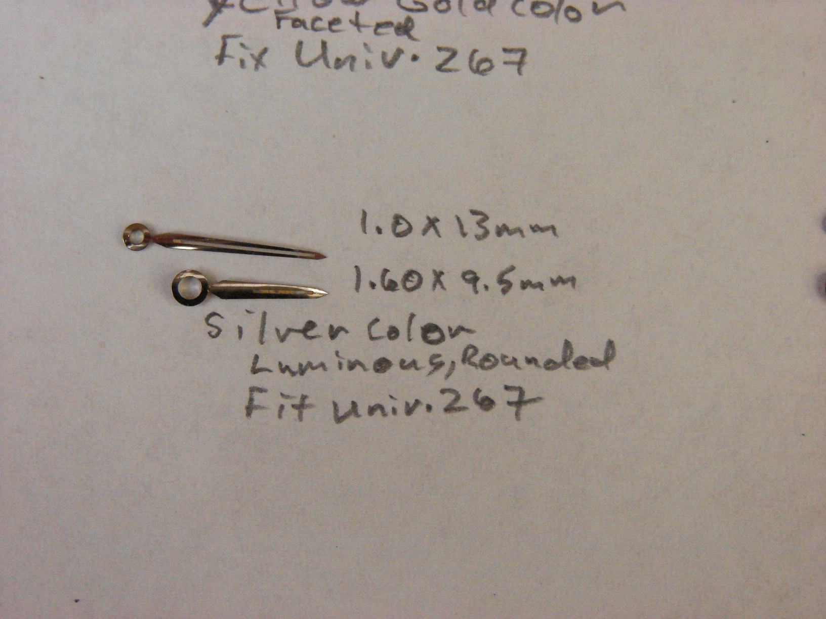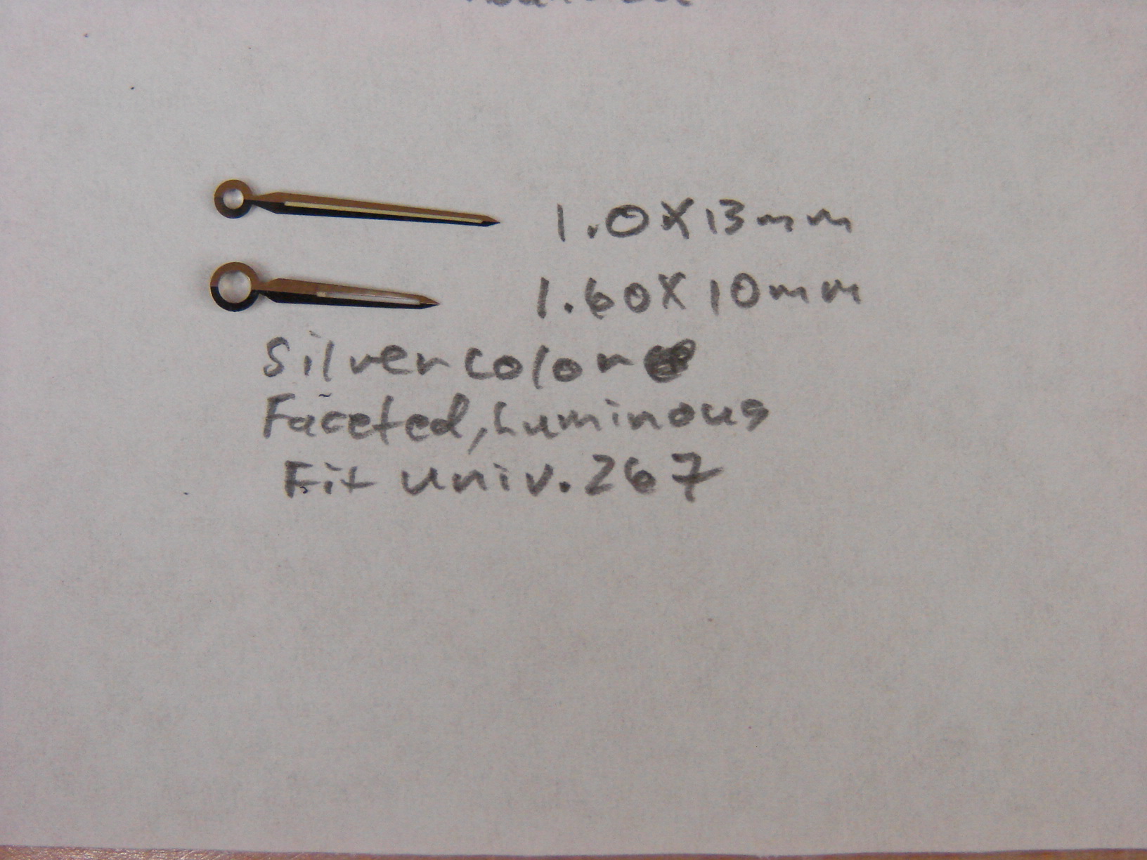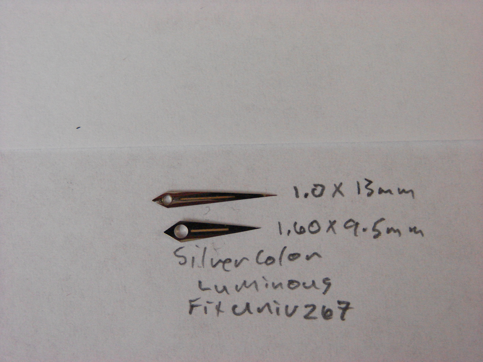 Wristwatch hands, silver color, dauphine, rounded top luminous style. High quality swiss made hands from the 1950's. Luminous no longer glows. Genuine UG hands for calibers 267, 281, 381, 481, 283, 383