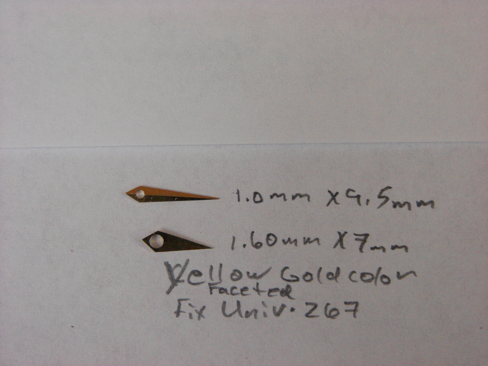 Wristwatch hands, yellow gold color, index ,faceted top style. High quality swiss made hands from the 1950's. Genuine UG hands for calibers 267, 281, 283, 481, 381, 383