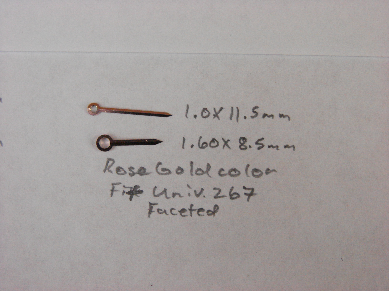 Wristwatch hands, rose gold color, index ,faceted top style. High quality swiss made hands from the 1950's. Genuine UG hands for calibers 267, 281, 381, 481, 283, 383