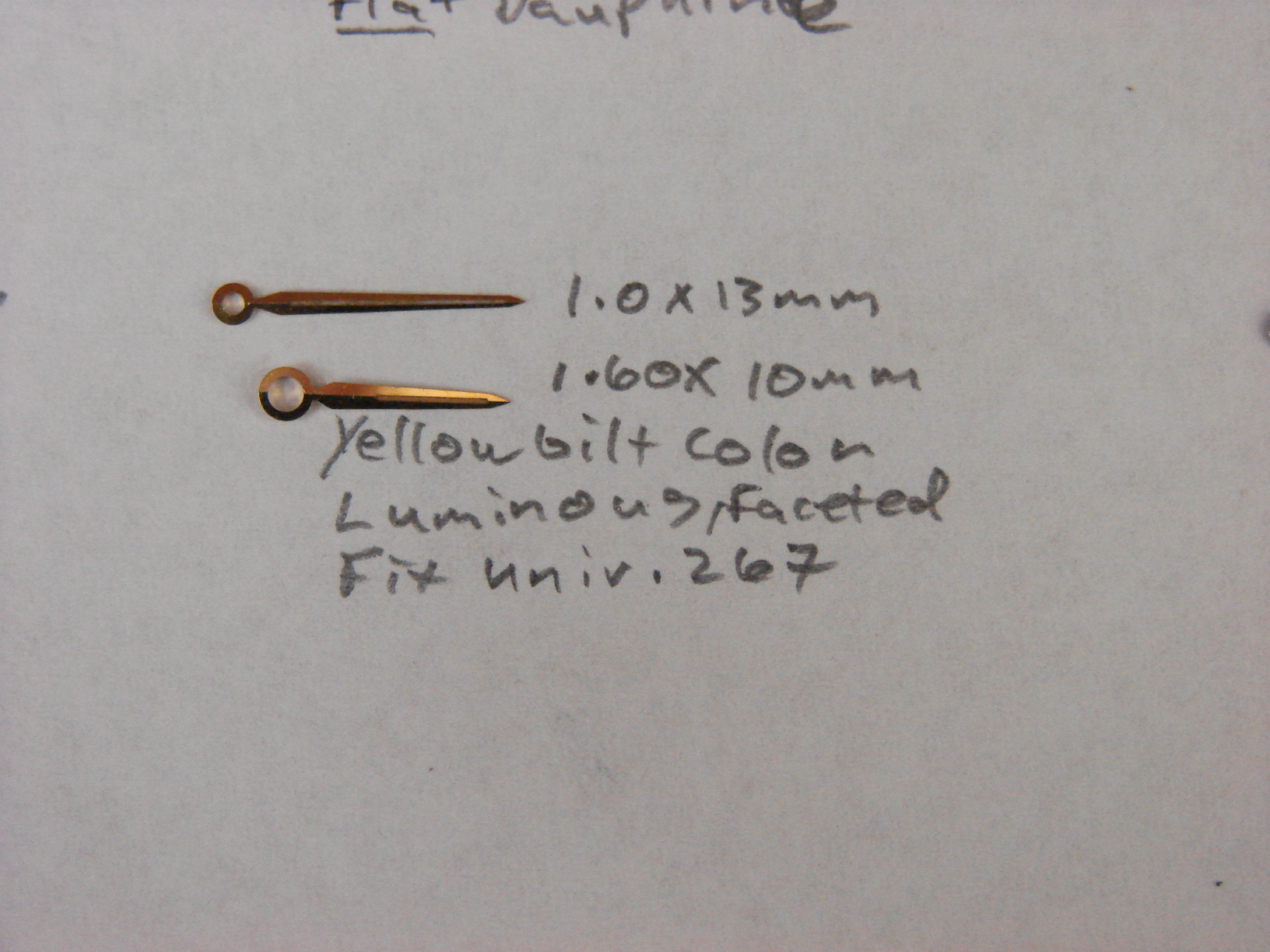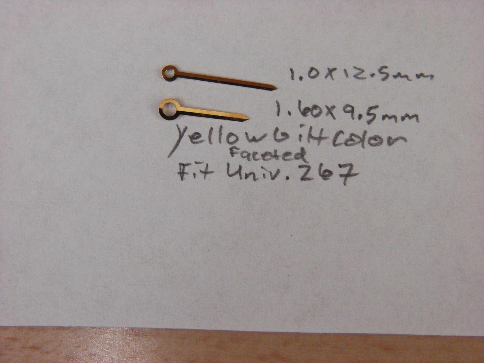 Wristwatch hands, yellow gilt color, alpha, faceted top luminous style. High quality swiss made hands from the 1950's. Luminous no longer glows. Genuine UG hands for calibers 267, 281, 381, 481, 283, 383